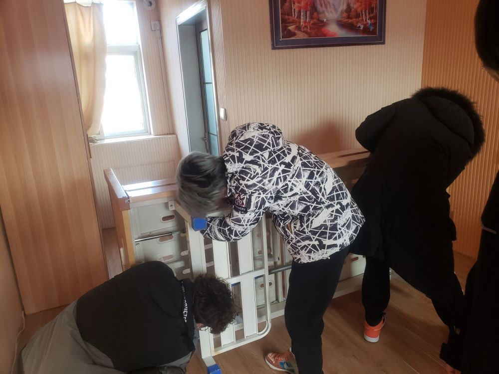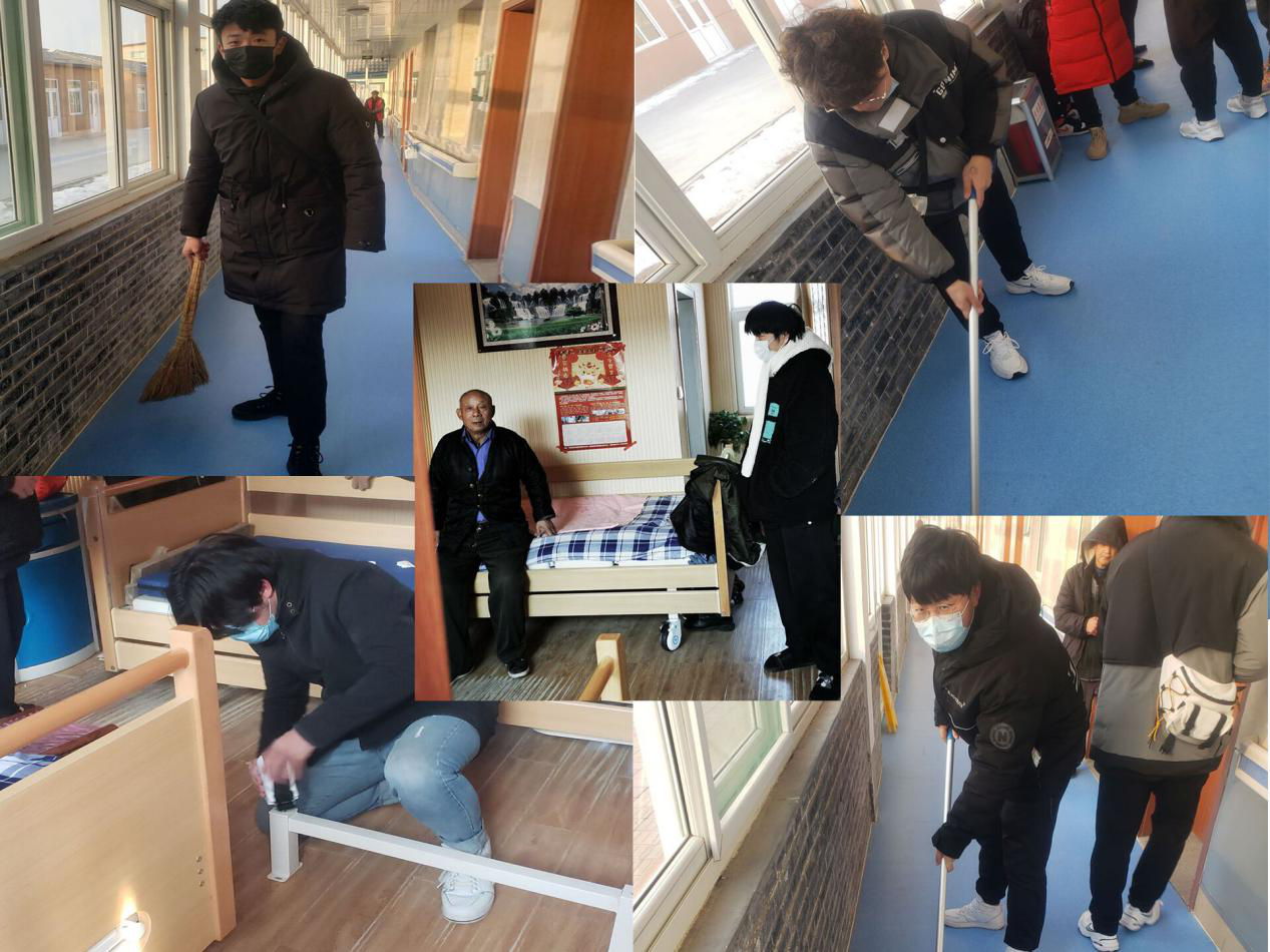 在为老人们更换床腿的过程中,爷爷讲述了年轻那会儿的故事,在我们眼里老人们就如同孩子一般,时光倒转,昔日是她们拿着小勺一口接一口耐心的将我们喂养长大,如今他们已经垂垂老矣,我们就变成了当年的他们。当他们重复又重复说着老掉牙的故事时,作为子女儿孙的我们应该体谅。老人们在日复一日的衰老中沉醉在这些回忆中。只是希望身边也能有个陪着他闲话家常的人!他们现在可能会常忘了扣扣子、系鞋带。吃饭时,会弄脏衣服,梳头发时手还会不停的抖,只要有亲人在一起,就会有很多的温暖涌上心头。如今,他们的脚站也站不稳,走也走不动。我们要紧紧的握着他们的手,陪着他们,慢慢的,就像当年一样带着我们一步一步地走。床腿换完了,几个队员开始帮院方拖拖地。还有几个队员去帮助铲除积雪了。