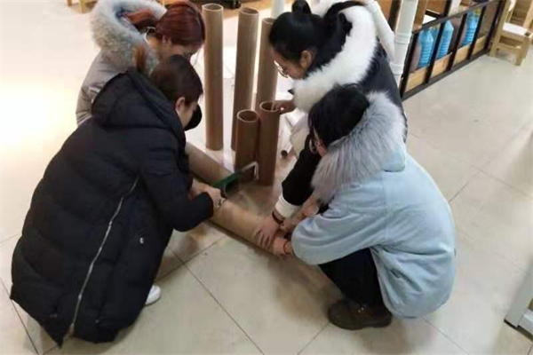 照片中,(王磊亭,董若曦,穆玉华,侯金玲)同学,正在帮助幼儿园老师裁剪塑料管并制作塑料管模型用于装作树木的枝干。并装饰点缀,用于几天后家长开放日参观活动。在她们的积极努力下成品顺利制作完成。
