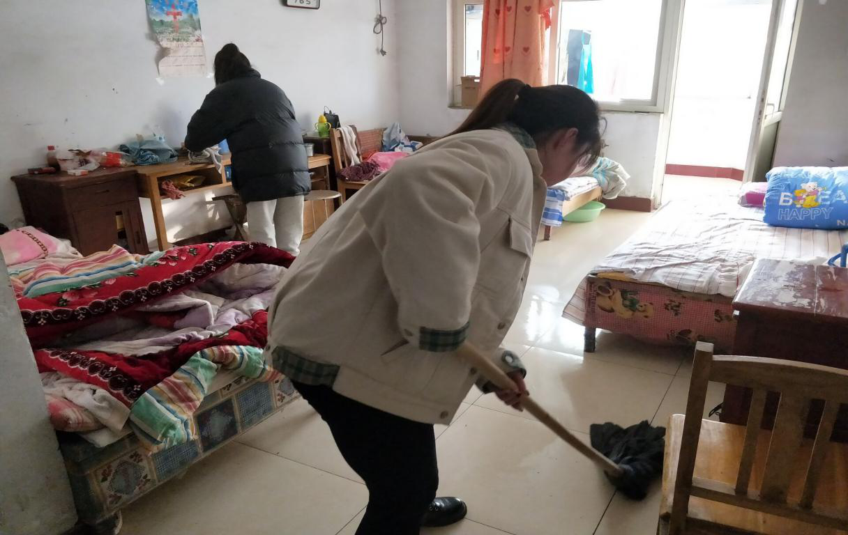 图为志愿者正在拖地,做一些力所能及的事情