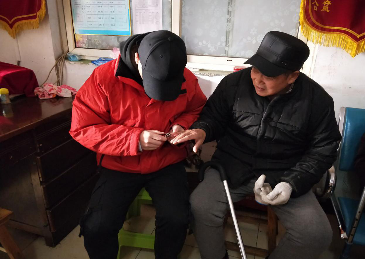 图为志愿者正在帮老人剪指甲