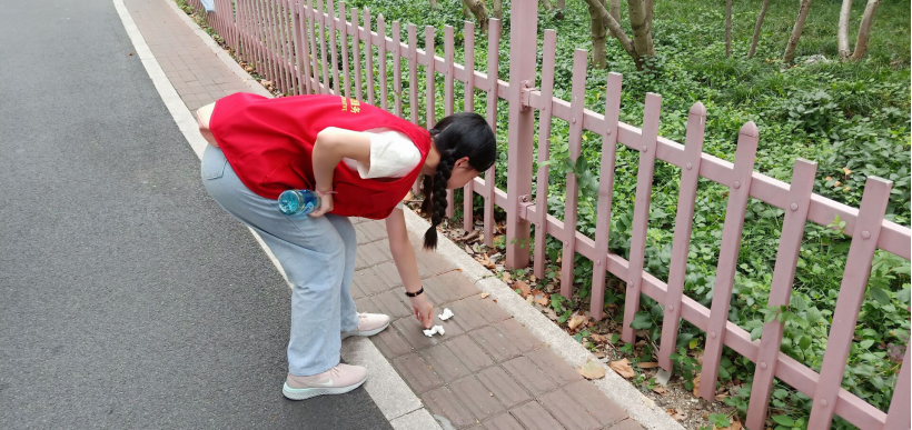 (志愿者将公园旁边地上的纸巾垃圾捡起)