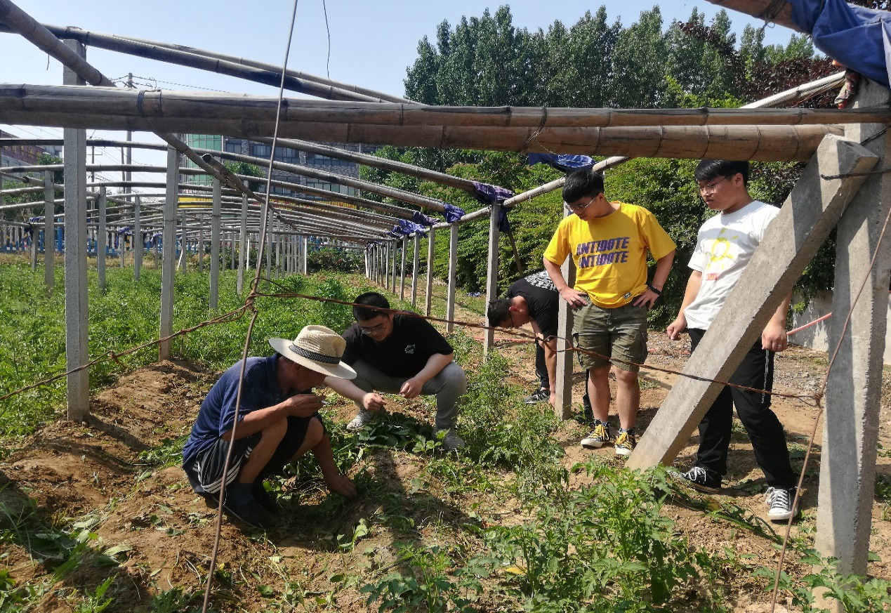 实践团成员帮助敬老院义工为蔬菜除草,敬老院食堂的蔬菜均为义工亲自种植