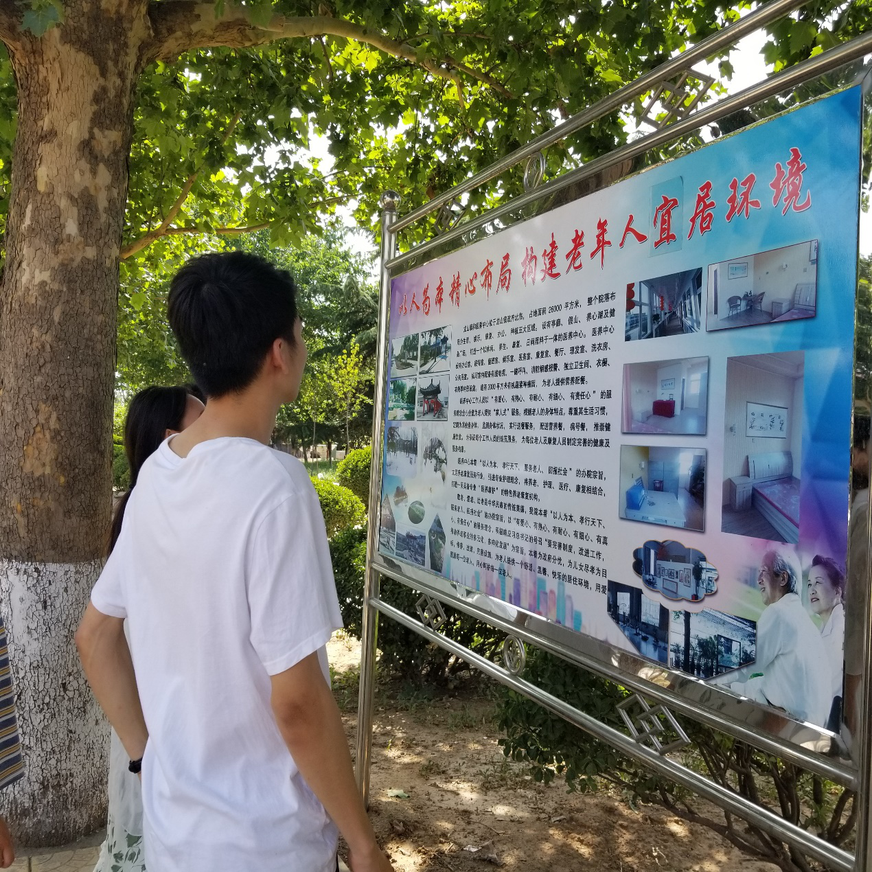 图为成员在参观敬老院的简介板,了解敬老院全貌,以便于更好为老人们服务