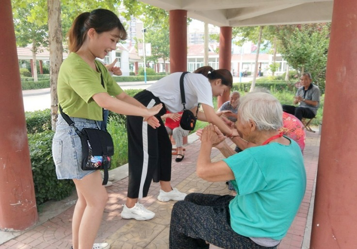 我们将已经睡好午觉坐在外面乘凉的老人集中在了有阴凉处的走廊里,我和奶奶聊天,问了奶奶的年龄,她们也问我们家里是哪里的,学习怎么样,还和我讲起了她们家乡的特产。许多老人家在午休之后都分散在各个走廊里三三两两的和自己的朋友们聊聊天喝茶,我和我的伙伴们将已坐在外面乘凉的老人集中在了有一个视野开阔又阴凉的走廊里,我和奶奶爷爷们聊家常,问了奶奶的年龄,还问了她们家庭大概的情况等,有的老人只身一人,孤苦伶仃的,有的老人是因为子女们太忙,无法照顾。老人们对我们的看望也是很开心的,对我们寒虚问暖