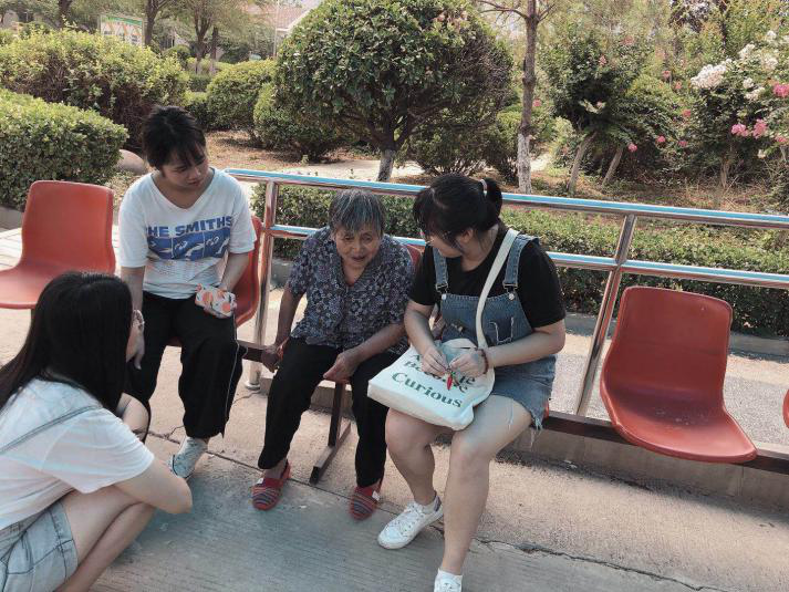 在做完清洁工作后,志愿者们来到老人们休闲娱乐的活动区域。老人们三五成群聚在一起。其中有一位老人给志愿者们留下深刻印象。这位老人九十岁高龄,面容苍老,步履蹒跚。在与老人聊天中,志愿者们了解到,这位老人膝下五个儿女。但都因为工作忙碌而无法妥善照顾老人。