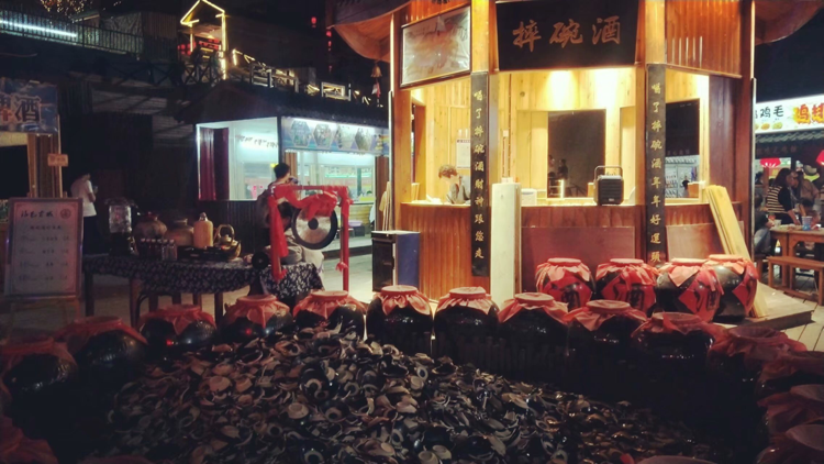 24日晚上,,大家从酒店出发,前往西安市东i门永兴坊,远远看过去就排着长长的队,多半是冲着摔碗酒去的,五块钱一碗, 深受人们的喜爱。这聚集全国各地的游客,游客把倒满酒的碗举过头顶,心中默默许愿,然后把酒-一饮而尽,碗口向下用力摔,摔碗-一响,口中大喊: "碎碎(岁岁)平安!”实践团也跟风了-波,不过是酒喝掉一口就摔了,清脆的摔碗声,摔走烦恼,摔走晦气,摔出豪迈,摔的不是酒碗,而是一种情怀。