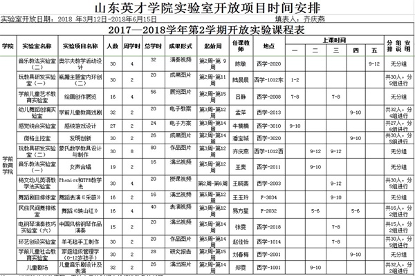 为了充分利用实验室的资源优势,提高学生自主学习的积极性,培养学生创新意识和创新能力,由学前教育实验教学中心精心组织的“开放性实验”开课啦!本学期共有15位优秀教师授课,内容涉及儿童音乐剧表演、发明创新、中国风格钢琴作品演奏、感统游戏设计等等精彩实验项目。以上实验课程免费对学生开放,实现实验室共享、项目共享、资源共享,欢迎各位同学前来观摩学习!